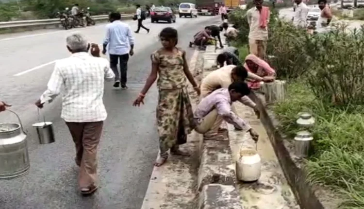 हाईवे पर पलटा घी से भरा टैंकर, भगौना-बाल्टी-पीपा लेकर भरने दौड़े लोग