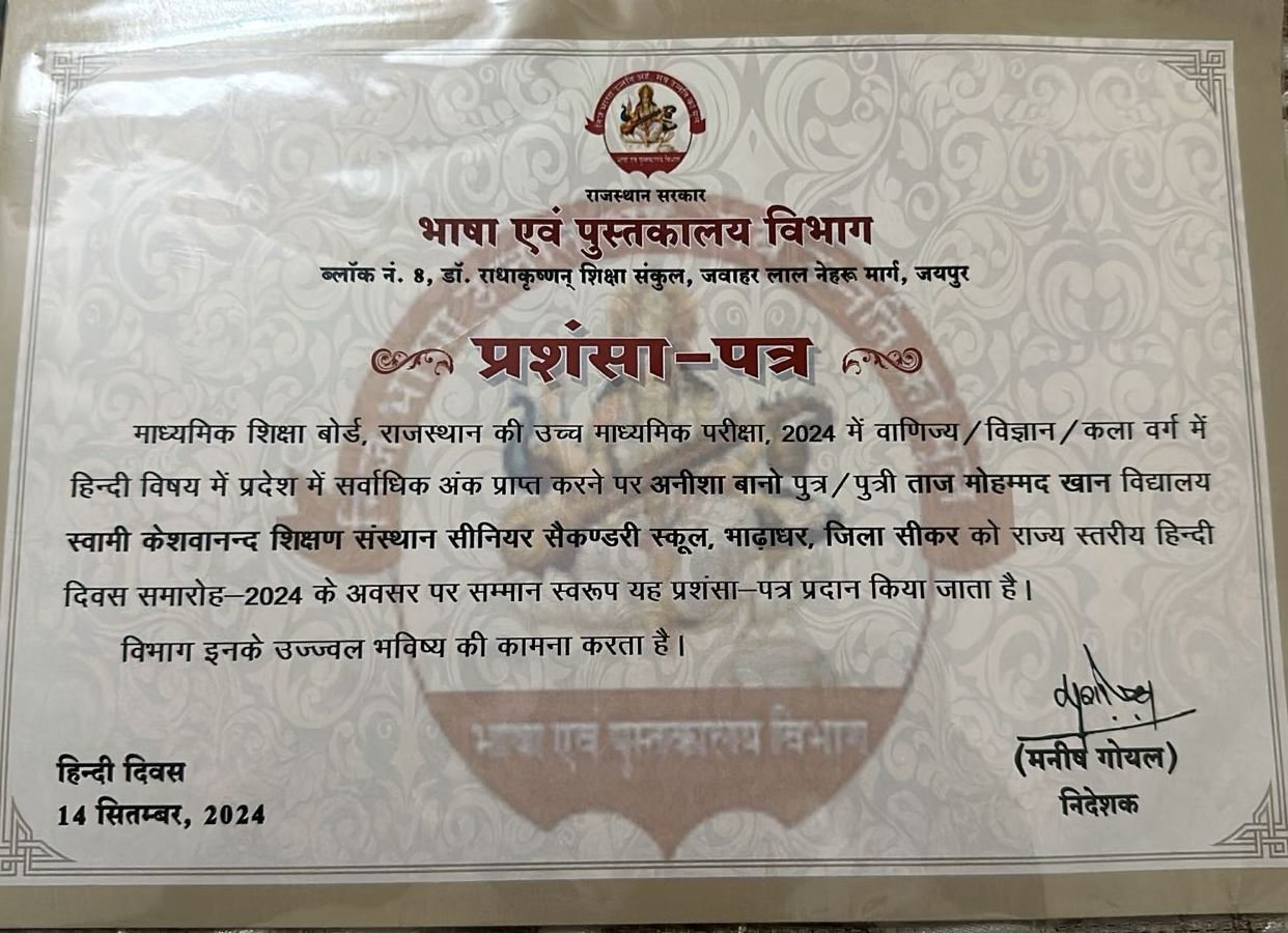 एनएच 52 स्थित स्वामी केशवानन्द शिक्षण संस्थान समूह भढाडर की छात्रा अनिशा बानो को राज्य स्तरीय हिन्दी दिवस समारोह में सम्मानित किया गया। जानकारी देते प्रधानाचार्य विजेन्द्र सिंह ने बताया कि संस्थान की कक्षा 12 की छात्रा अनिशा बानो को माध्यमिक शिक्षा बोर्ड राजस्थान की उच्च माध्यमिक परीक्षा 2024 में हिन्दी विषय में प्रदेश में सर्वाधिक अंक हासिल करने पर भाषा एवं पुस्तकालय विभाग जयपुर द्वारा आयोजित राज्य स्तरीय हिन्दी दिवस समारोह 2024 में सम्मानित किया गया।
