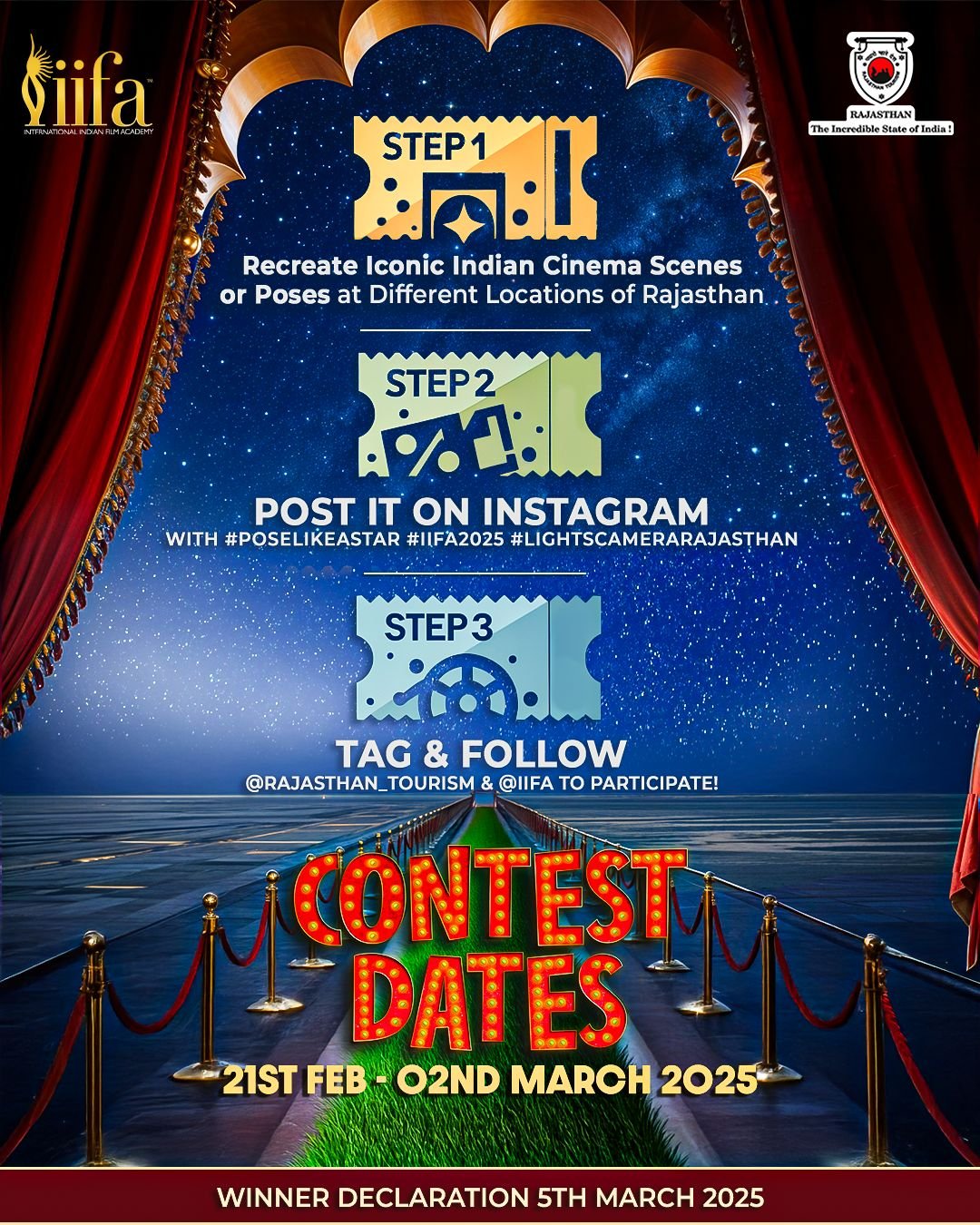 ऐतिहासिक धरोहरों और समृद्ध संस्कृति के लिए मशहूर राजस्थान अब भारतीय सिनेमा के उत्सव में नई चमक जोड़ने जा रहा है। आईफा-2025 के तहत राजस्थान पर्यटन विभाग ने रोमांचक सोशल मीडिया प्रतियोगिता ‘पोज लाइक ए स्टार’लॉन्च की है, जिसमें भाग लेकर सिनेमा प्रेमियों को आईफा 2025 का टिकट जीतने का सुनहरा अवसर मिलेगा।