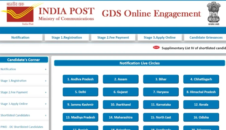 इंडिया पोस्ट ने अपनी आधिकारिक वेबसाइट पर सभी सर्किलों के शॉर्टलिस्ट किए गए उम्मीदवारों की ग्रामीण डाक सेवक अनुपूरक लिस्ट IV जारी की है. उम्मीदवार अब आधिकारिक वेबसाइट – https://indiapostgdsonline.gov.in/ पर इंडिया पोस्ट की चौथी मेरिट लिस्ट देख सकते हैं. शॉर्ट-लिस्टेड कैंडिडेट्स को 9 सितंबर, 2022 को या उससे पहले अपने नाम के सामने उल्लिखित डिवीजनल हेड के माध्यम से अपने डॉक्यूमेंट वेरिफिकेशन करवाने हैं.