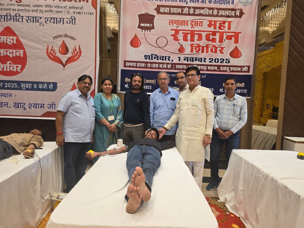 इक ख्वाहिश फाउंडेशन एनजीओ सीकर एवं जल सेवा समिति खाटू श्याम जी के संयुक्त तत्वाधान में बाबा श्याम के जन्मोत्सव के उपलक्ष में दूसरा रक्तदान सेवा शिविर का आयोजन किया गया. फाउंडेशन की निदेशक डॉ सुनीता चौधरी ने बताया कि छत्तीसगढ़ भवन खाटू श्याम जी में आयोजित शिविर का मुख्य अतिथि खाटुश्याम जी मंदिर कमेटी के प्रताप सिंह चौहान एंव डॉ लक्ष्मण सिंह ओला पूर्व निदेशक चिकित्सा स्वास्थ्य एवं परिवार कल्याण सेवाएं राजस्थान द्वारा दीप प्रज्जवलित कर शुभारंभ किया गया शिविर को संबोधित करते हुए मुख्य अतिथि डॉ॰ ओला ने बताया कि रक्तदान एक नेक और जीवन रक्षक कार्य है हर किसी को ब्लड डोनेट करना चाहिए. दीपक अग्रवाल ने बताया कि दोनों संस्था हर साल एकादशी के दिन डोनेशन केंप लगाती हैं जिसमें श्यामप्रेमी बढ़ चढ़कर भाग लेते हैं, देश भर से लोग आए और रक्तदान शिविर में अहम भूमिका निभाई । सिंगर पप्पू शर्मा ने केम्प की सराहना करते हुए रक्तदान शिविर को भव्य आयोजन बताते हुए कहा कि रक्तदान जीवनदान होता है इसलिए रक्तदान से बड़ा कोई दान नहीं होता । पंकज गर्ग ने बताया रक्तदान शिविर में 143 यूनिट ब्लड संग्रह हुआ इस मौके पर शिक्षाविद श्यामसुंदर डीसीआई चेयरमैन राजेश भारद्वाज, सुलतान सिंह, सूर्य रोशनी के डायरेक्टर एस एन बंसल, अंकुर गुप्ता,शीतल पाण्डे सौरव शर्मा,ओमप्रकाश काजला अरमान नीतू कंवर रोहित, गौरव, अमित पीके जवाहर परमेश्वर आदि मौजूद रहे।