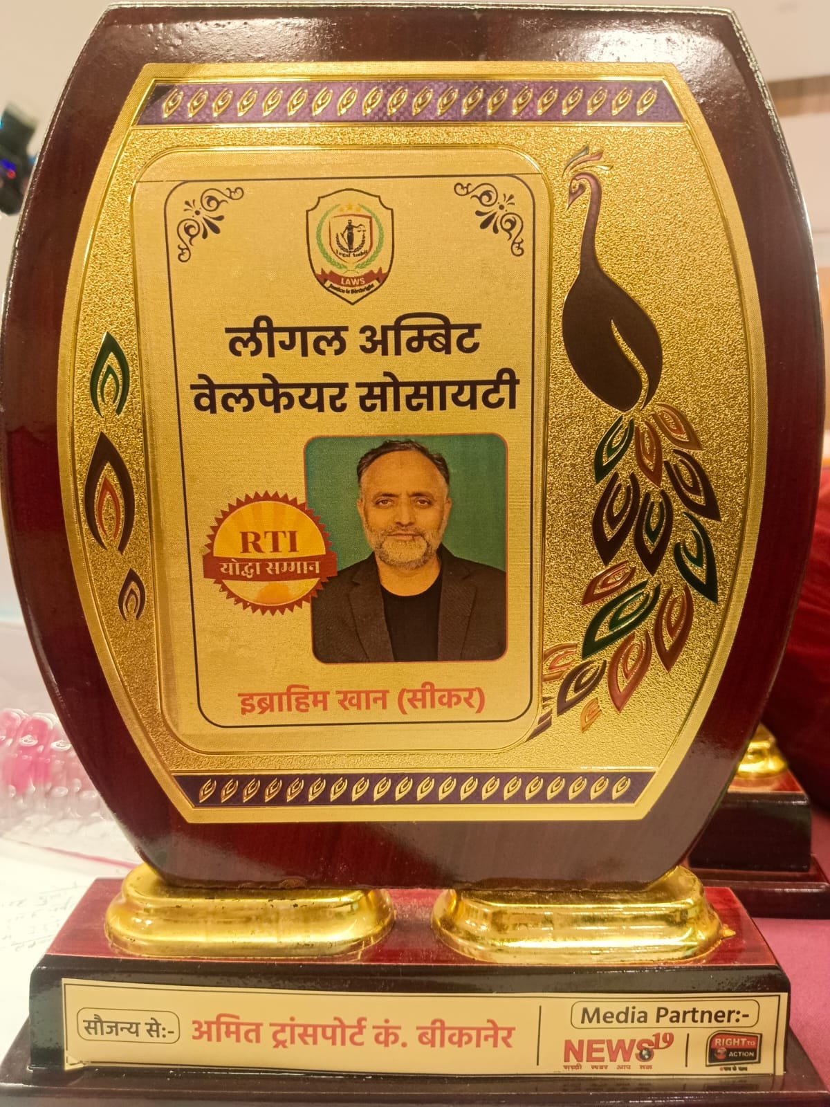 जयपुर में रिक. कानूनी कल्याण एंबिट सोसायटी के द्वारा इब्राहिम खान कोहिनूर को योद्धा सम्मान से सम्मानित किया गया। इस मौके पर सेवानिवृत्त आईएएस राजेंद्र, कानूनी प्रमुख राव और सीईओ महावीर पारीक, न्यूज 19 एमडी और टीवी स्टार जेआर अन्नू कपूर मौजूद रहे।