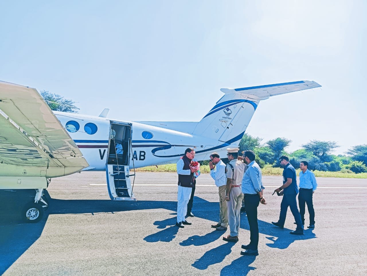 उत्तराखण्ड के मुख्यमंत्री पुष्कर सिंह धामी शुक्रवार को तारपुरा हवाई पट्टी पर पहुंचे जहां पर जिला कलेक्टर मुकुल शर्मा, पुलिस अधीक्षक भुवन भूषण यादव, अतिरिक्त पुलिस अधीक्षक गजेन्द्र सिंह जोधा ने मुख्यमंत्री धामी की गुलदस्ता देकर अगवानी की।