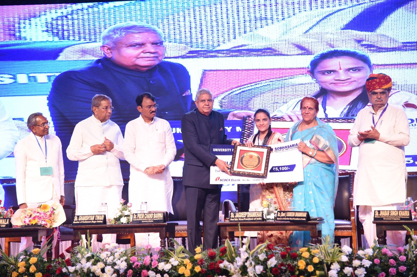 कार्यक्रम से पूर्व तारपुरा हवाई पट्टी पर उपराष्ट्रपति जगदीप धनखड के पहुंचने पर नगरीय विकास एवं स्वायत्त् शासन राज्य मंत्री झाबर सिंह खर्रा, पुलिस उप महानिरीक्षक सत्येन्द्र सिंह, जिला कलेक्टर मुकुल शर्मा, पुलिस अधीक्षक भुवन भूषण यादव ने अगवानी की। कार्यक्रम में पद्मश्री प्रहलाद अग्रवाल, चैयरमेन शोभासरिया ग्रुप ऑफ इंस्टीट्यूशंस, डॉ. घनश्याम अग्रवाल, कुंज बिहारी अग्रवाल, वाईस चैयरमेन जीपी अग्रवाला, ग्रुप प्राचार्य डॉ. एल सौलंकी,शोभासरिया कॉलेज प्राचार्या हर्षिता गर्ग, राज्य सभा सांसद घनश्याम तिवाडी, पूर्व सांसद सीकर स्वामी सुमेधानंद सरस्वती, भाजपा जिला अध्यक्ष कमल सिखवाल, सुरेश अग्रवाल, पन्ना लाल सारडा, कांताप्रसाद मोर, जगदीश चौकडीका, सीए सुनिल मोर सहित सोभासरिया इंजीनियरिंग महाविद्यालय के छात्र—छात्राए, जनप्रतिनिधि गणमान्य नागरिक उपस्थित रहें।