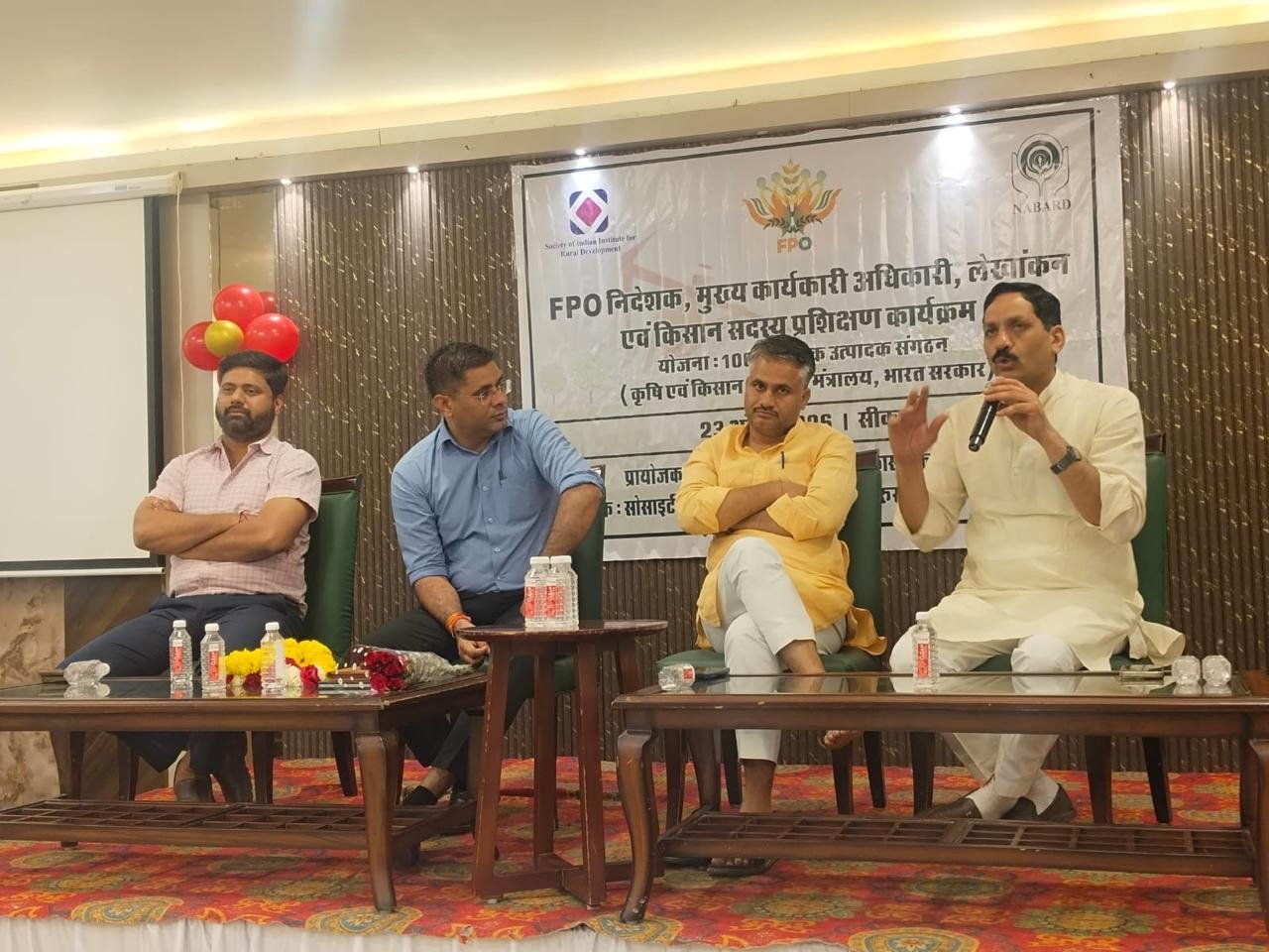क़ृषि एवं किसान कल्याण मंत्रालय, भारत सरकार एवं राष्ट्रीय क़ृषि और ग्रामीण विकास बैंक (नाबार्ड) के तत्वाधान में सीकर में 10 हज़ार एफपीओ हेतु केंद्रीय क्षेत्र योजना के तहत सीकर और नीमकाथाना व झुंझुनू ,नागौर में सीबीबीओ यथा सोसाइटी ऑफ़ इंडियन इंस्टिट्यूट फॉर रूरल डेवलपमेंट (एसआईआईआरडी) द्वारा संचालित विभिन्न 4 कृषक उत्पादक संगठनों के मुख्य कार्यकारी अधिकारीयों एवं बोर्ड मेंबर्स हेतु एक दिवसीय प्रशिक्षण कार्यशाला का आयोजन किया गया I उपरोक्त कार्यशाला में उपस्थित किसानों को डीडीएम सीकर एम एल मीना, खंडेला FPO के मैनेजिंग डायरेक्टर Dr नेकीराम आर्य, एसआईआईआरडी सीईओ तुषार शर्मा, एफपीओ कार्यक्रम प्रमुख प्रदीप भातरा ने विभिन्न विषयों पर जानकारी उपलब्ध करवाई एवं सभी कृषक उत्पादक संगठनों को ज्यादा से ज्यादा सरकारी योजनाओं का लाभ लेते हुए अपने किसान सदस्यों को अधिक से अधिक गतिविधियों के माध्यम से लाभान्वित करें l इस अवसर पर सीकर जिले में संचालित नीमकाथाना फार्मर प्रोड्यूसर कंपनी लिमिटेड नीमकाथाना , ब्रेसिका एग्रो फार्मर प्रोड्यूसर कम्पनी लिमिटेड पाटन, अजीतगढ़ एग्रो फार्मर प्रोड्यूसर कम्पनी लिमिटेड अजीतगढ़ एवं ग्रीन पथ एग्रो फार्मर प्रोड्यूसर कम्पनी लिमिटिड खंडेला बुहाना खेतड़ी मुंडवा के समस्त बोर्ड ऑफ डायरेक्टर्स, मुख्य कार्यकारी अधिकारी सहित बड़ी संख्या में किसान उपस्थित रहे तथा निम्न विषयो पर चर्चाए की गई जिसमें डीडीएम नाबार्ड एम एल मीणा ने गवर्नेंस एवं मैनेजमेंट और बिज़नेस प्लान डेवलपमेंट पर एफपीओ के बारे मे विस्तार से चर्चा की, आर एम धनकड़ ने सरकार की विभिन्न योजनाओं के बारे में बताया, सीबीबीओ एसआईआईआरडी के सीईओ तुषार शर्मा ने एपीओ विभिन्न विषयों पर प्रकाश डाला, परियोजना प्रबंधक प्रदीप भातरा ने कृषक उत्पादन संगठनों की कार्यशैली एवं इसके आगामी विषयो पर प्रकाश डाला, राजेश गुर्जर ने प्रोसेसिंग यूनिट के बारे में बताया एवं एफपीओ योजना किसानों के लिए वरदान साबित होगी l भारत सरकार द्वारा यह योजना उनके भिन्न-भिन्न क्षेत्रों के लिए लाभकारी होगी l जिला समन्वयक मनीष शर्मा ने कहा कि एफ़पीओ में जो किसान सूचीबद्ध होंगे उनको भारत सरकार की किसान कल्याणकारी योजनाओं का भरपूर लाभ मिलेगा । उपस्थित निदेशक मंडल व किसानों ने अपने अपने क्षेत्र में स्थापित एफपीओ में अधिक से अधिक किसानों को जोड़कर योजनाओं का लाभ दिलाने का विस्वास दिलाया। जिसमें एसआईआईआरडी जिला समन्वयक मनीष शर्मा, राजेश गुर्जर, डॉ नेकीराम आर्य ,सुनील खटकड सहित बड़ी संख्या में प्रतिनिधि उपस्थित रहे हैं