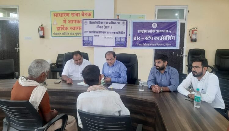 सचिव द्वारा काउसलिंग एवं मेगा विधिक जागरूकता शिविर में उपस्थित लोगों को बताया कि रालासा के निर्देशानुसार राष्ट्रीय लोक अदालत में बैंक, बीमा कम्पनियों के द्वारा प्री—लिटिगेशन प्रकरणों में धारा 138 एन.आई.एक्ट, धन वसूली, श्रम एवं नियोजन, बिजली—पानी, भरण—पोषण से संबंधित प्रकरण एवं सीकर न्यायक्षेत्र के न्यायालयों में लंबित दाण्डिक शमनीय, धारा 138 एन.आई.एक्ट धन वसूली, एम.ए.सी.टी, श्रम व नियोजन, वैवाहिक, भूमि अधिग्रहण, मजदूरी, भत्ते और पेंशन भत्तों एवं अन्य सिविल मामलों का निस्तारण लोक अदालत के माध्यम से किया जायेगा.