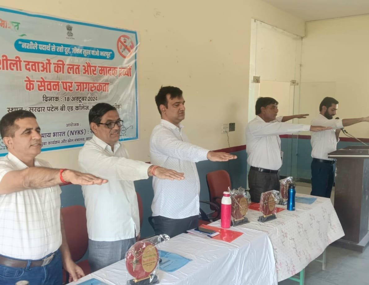 युवा कार्यक्रम एवं खेल मंत्रालय भारत सरकार के अंतर्गत संचालित नेहरू युवा केंद्र के द्वारा माय भारत के तहत नशीली दवाओं की लत और मादक द्रव्यों के सेवन पर जागरूकता कार्यक्रम का आयोजन सरदार पटेल बी एड कॉलेज कटराथल में किया गया | मुख्य अतिथि अतिरिक्त मुख्य चिकित्सा एवं स्वास्थ्य अधिकारी डॉ हर्षल चौधरी ने युवाओं को नशे के दुष्प्रभाव आदि के बारे में लोगों को जानकारी देने के लिए काउंसलर की भूमिका निभाने के लिए प्रेरित किया | जो युवा नशे की लत से मजबूर हैं उनको विभिन्न कैंपों से जुड़कर नशे से दूर करने के लिए जागरूक किया | जिला युवा अधिकारी मोहित कुमार ने युवाओं को विभिन्न प्रकार की ड्रग्स के बारे में एवं उनके दुष्प्रभाव के बारे में जानकारी प्रदान की एवं युवाओं को सकारात्मक सोच के साथ जीवन अपनाने के लिए प्रेरित किया | इसके साथ ही मोहित कुमार ने युवाओं को नशा मुक्ति की शपथ दिलवाई | लेखा अधिकारी स्वास्थ्य विभाग बजरंग बगड़िया ने युवाओं को राजस्थान में नशे से प्रभावित क्षेत्रौ के बारे में जानकारी प्रदान की एवं मादक द्रव्यों के सेवन पर नकारात्मक प्रभाव के प्रति जागरूक रहने के लिए प्रेरित किया |