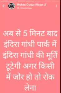 पूर्व प्रधानमंत्री इंदिरा गांधी की प्रतिमा खंडित, स्टेटस लगाकर 5 मिनट के बाद मूर्ति तोड़ने की धमकी