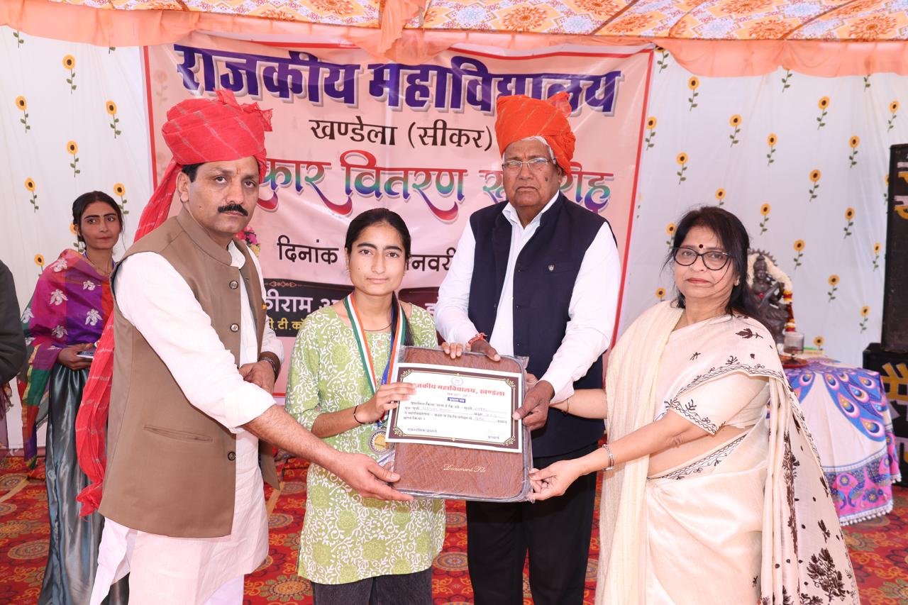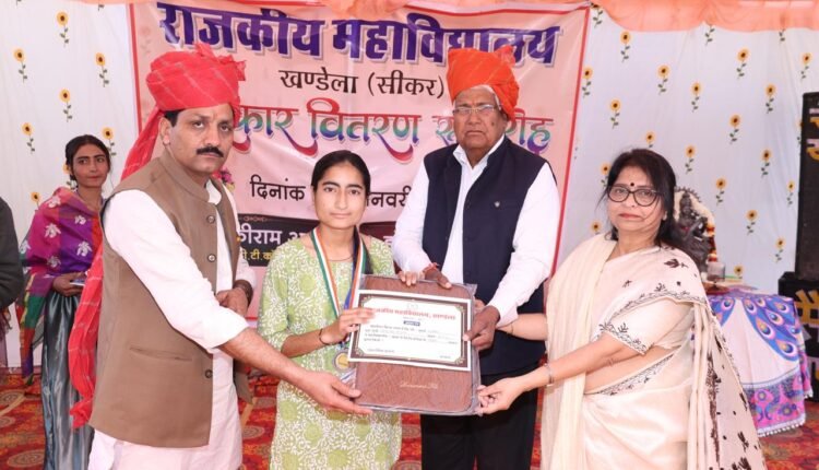 राजकीय महाविद्यालय खंडेला में प्रथम वार्षिकोत्सव एवं पुरस्कार वितरण समारोह का आयोजन किया गया l कार्यक्रम संयोजक प्रोफ़ेसर अमरनाथ वर्मा ने बताया कि कार्यक्रम की अध्यक्षता महाविद्यालय प्राचार्य प्रोफ़ेसर अनुपमा सक्सेना ने की l कार्यक्रम में मुख्य अतिथि समाजसेवी शिक्षाविद् डॉ नेकीराम आर्य एवं विशिष्ट अतिथि के रूप में डॉ सीता राम सैनी वैज्ञानिक DRDO उपस्थित रहे l समारोह में विगत तीन वर्षों के सभी कक्षा टॉपर्स को प्रशस्ति पत्र मोमेंटो व मेडल देकर सम्मानित किया गया अतिथियों द्वारा महाविद्यालय टॉपर्स विकास कुमावत ,बलबीर योगी , मोनिका सहित विश्वविद्यालय स्तर पर गोल्ड मेडल अर्जित छात्रा रैनी को भी सम्मानित किया गया l खेल कूद व सांस्कृतिक पुरस्कारो सहित 55 छात्र छात्राओं को पुरस्कृत किया गया l