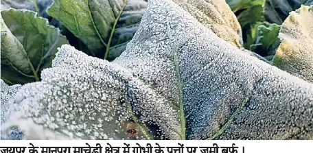 माउंट आबू में 1.2 डिग्री सेल्सियस और जयपुर में 7.8 डिग्री सेल्सियस तापमान दर्ज किया गया। मौसम विभाग ने 19 दिसंबर तक शीतलहर का असर बने रहने की संभावना जताई है। इस दौरान अलवर, झुंझुनूं, सीकर, चूरू और हनुमानगढ़ में यलो अलर्ट जारी किया गया है, जबकि सीकर में ओरेंज अलर्ट जारी किया गया है। जयपुर के मानपुरा माचेड़ी क्षेत्र में गोभी के पत्तों पर जमी बर्फ भी देखी गई।