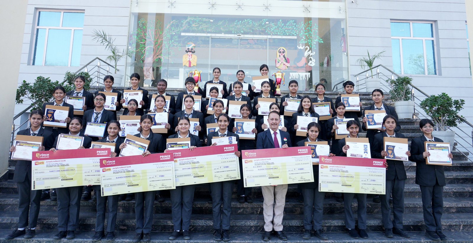 सम्मान समारोह में प्रिंस एजुहब चेयरमैन डॉ. पीयूष सुण्डा, मुख्य प्रबंध निदेशक राजेश ढिल्लन, प्रबंध निदेशक एम. आर. अग्रवाल, प्रिंसिपल पूनम चौहान, एकेडमिक हेड धर्मपाल सिंह, जयपाल सिंह एवं बैंड इंस्ट्रक्टर कैप्टन के.सी. भट्ट द्वारा बैंड टीम को उनकी शानदार उपलब्धियों के लिए 2 लाख रुपये का नकद पुरस्कार, प्रशस्ति पत्र एवं स्मृति चिह्न प्रदान कर सम्मानित किया। समारोह में विज्ञान प्रदर्शनी के अंतर्गत ड्रोन बनाकर अपनी प्रतिभा का उत्कृष्ट प्रदर्शन करने वाले कक्षा 10वीं के छात्र नमन को 21,000 रुपये की नकद राशि से सम्मानित किया गया। कार्यक्रम में कोऑर्डिनेटर्स एवं फैकल्टी मेंबर्स सहित हजारों विद्यार्थी उपस्थित रहे।