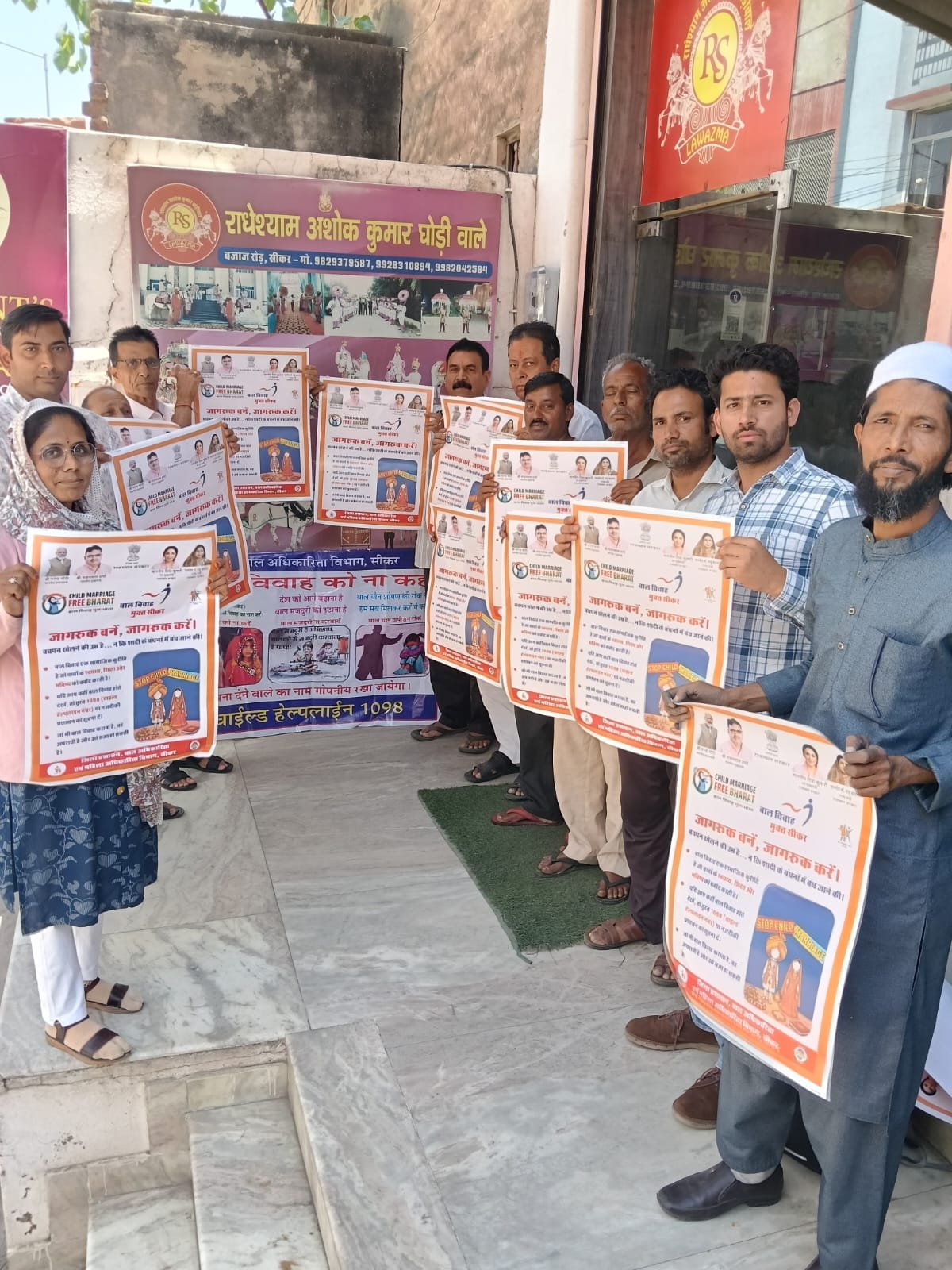 जिला बाल संरक्षण इकाई की सहायक निदेशक गार्गी शर्मा ने बताया कि बाल अधिकारिता विभाग, सीकर की ओर से अक्षय तृतीया (आखा तीज) व पीपल पूर्णिमा जैसे अबूझ सावों पर बाल विवाह रोकथाम के लिए जागरूकता अभियान चलाया गया। इसके तहत बुधवार को चाइल्ड हेल्पलाइन 1098, सीकर द्वारा शहर में अशोक बैण्ड बाजा व राधेश्याम घोड़ीवाला के सहयोग से बाल विवाह रोकथाम जागरूकता कार्यक्रम आयोजित किया गया, जिसमें बैण्ड बाजा टीम, संचालकों व राधेश्याम घोड़ीवाला को बाल विवाह में शामिल नहीं होने की शपथ दिलाई गई।