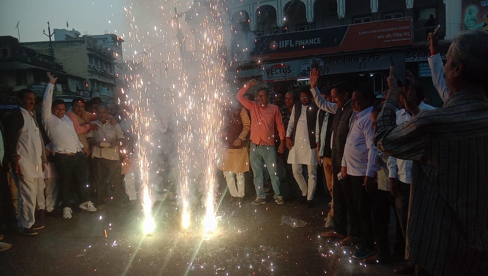 भाजपा को राजस्थान में हुए विधानसभा चुनाव एवं महाराष्ट्र विधानसभा चुनावों में मिली ऐतिहासिक सफलता का जश्न पदाधिकारियों व कार्यकर्ताओं ने शनिवार को जाट बाजार में मनाया। भाजपा की इस जीत की खुशी पर जमकर आतिशबाजी की गई और एक दूसरे को मिठाई खिलाई गई। कार्यकर्ताओं ने जीत की खुशी में नारेबाजी करते हुए आकाश को गुंजायमान कर दिया।