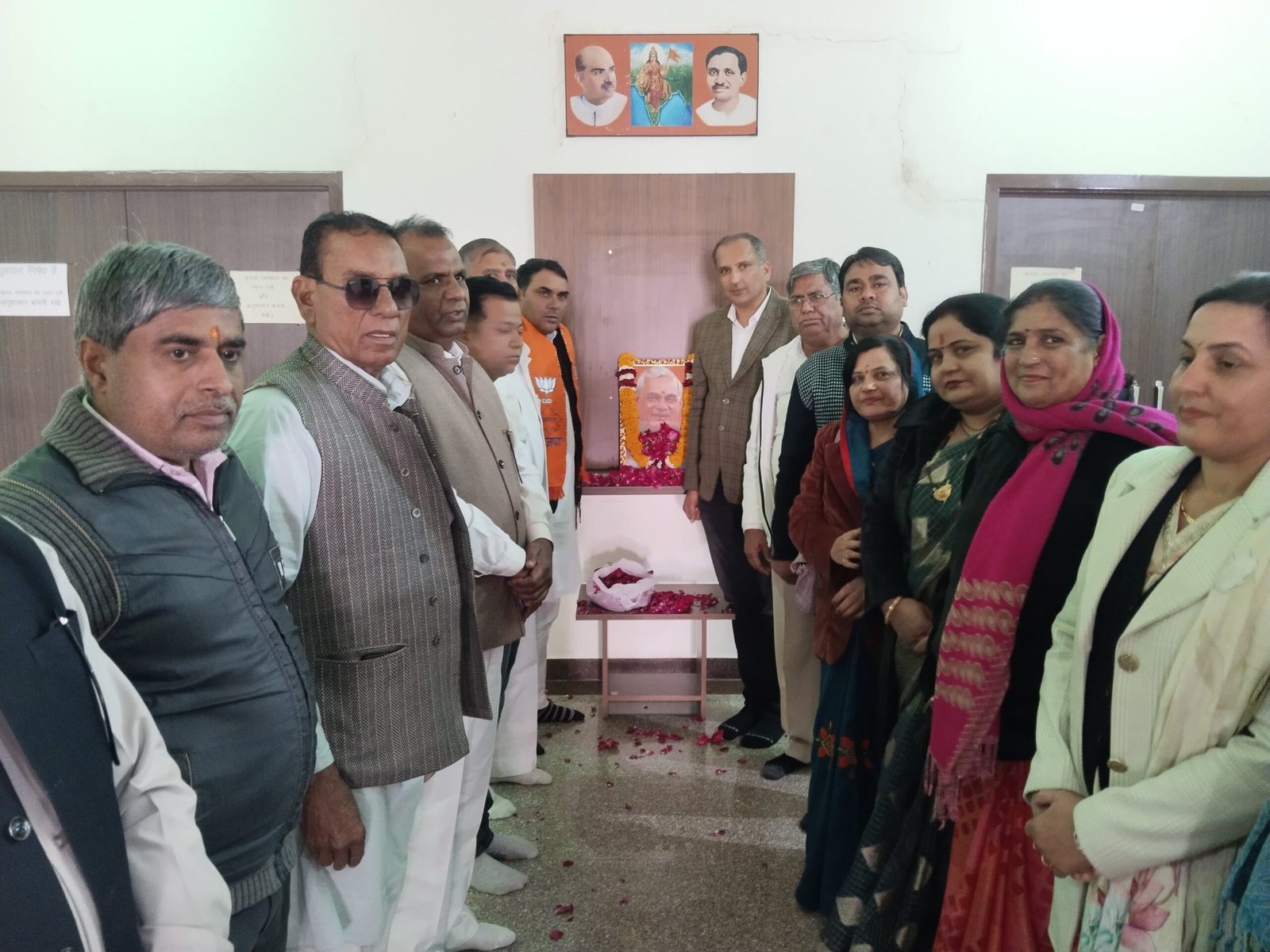 भारत रत्न पूर्व प्रधानमंत्री स्व. अटल बिहारी वाजपेयी की जयंती बुधवार को भाजपा जिला कार्यालय में मनाई गई। जिलाध्यक्ष डॉ. कमल सिखवाल की अध्यक्षता में आयोजित जयंति कार्यक्रम में भाजपा पदाधिकारियों व कार्यकर्ताओं ने स्व. अटल बिहारी वाजपेयी की तस्वीर पर पुष्पांजलि अर्पित कर श्रद्धासुमन व्यक्त किए।