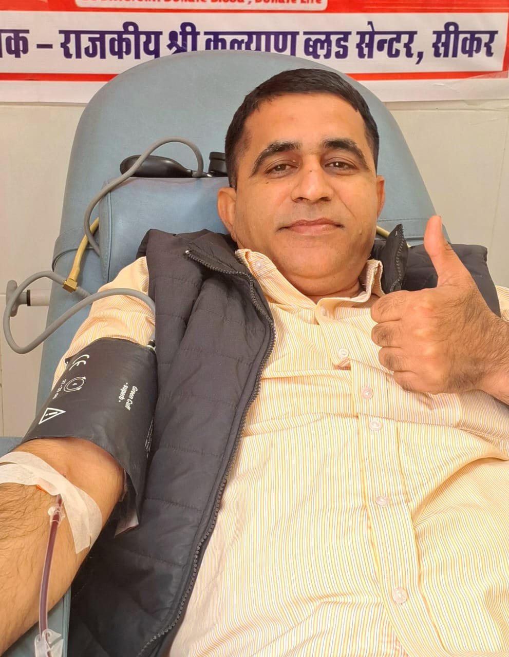 श्री कल्याण मेडिकल कॉलेज एवं हॉस्पिटल लैब अधीक्षक सतेन्द्र सिंह कुड़ी ने बताया कि नवलगढ़ क्षेत्र निवासी बालिका ज्योति सैनी जो कि राजकीय जनाना हॉस्पिटल में भर्ती है को इमरजेंसी के दौरान रक्त की जरूरत पड़ने पर परिजनों द्वारा सूचना देने पर पर सुधीर महरिया स्मृति संस्थान और यूनाइटेड एजुकेशन लिंक्ज के डायरेक्टर ग्राम केशरनगर , कोलीड़ा निवासी बी एल मील ने श्री कल्याण हॉस्पिटल ब्लड सेंटर पहुंचकर 152 वीं बार रक्तदान कर मानवता की मिशाल पेश की है |