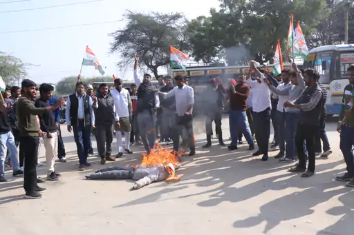 आंबेडकर सर्किल के पास मंगलवार को युवा कांग्रेस कार्यकर्ताओं ने सीकर संभाग को हटाए जाने के विरोध में प्रदर्शन किया। कार्यकर्ताओं ने युवा कांग्रेस जिलाध्यक्ष आसिफ खान के नेतृत्व में मुख्यमंत्री भजनलाल शर्मा का पुतला जलाकर आक्रोश जताया और नारेबाजी की।