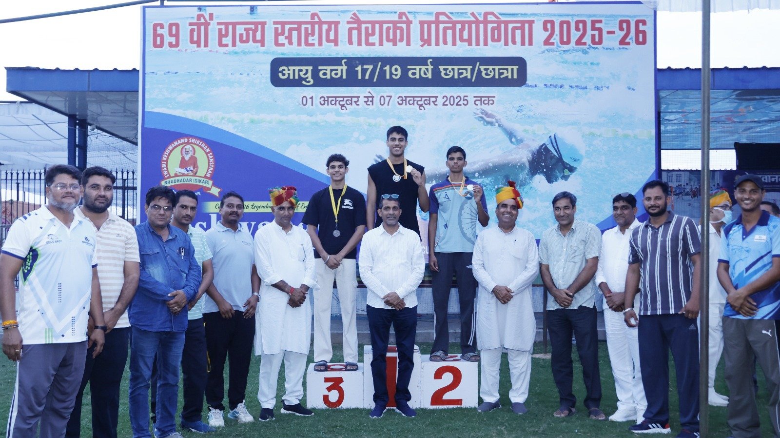 एनएच 52 स्थित स्वामी केशवानन्द शिक्षण संस्थान समूह भढाडर सीकर के स्पोर्ट्स कॉम्पलेक्स स्थित तरणताल पर चल रही 69वीं राज्य स्तरीय तैराकी प्रतियोगिता 17/19 वर्ष छात्र/छात्रा के तीसरे दिन 24 प्रतियोगिता आयोजित हुई। जानकारी देते हुए खेल प्रभारी राहुल ढाका ने बताया कि 19 आयु छात्र वर्ग में 100 मी. फ्री स्टाईल में सीकर के कुनाल फौजदार ने गोल्ड मैडल, 50 मी. ब्रेस्ट स्ट्रोक में सीकर के मोहम्मद अनस ने गोल्ड मैडल, 200 मीटर बटर फलाई में जयपुर के साहिल गुप्ता ने गोल्ड मैडल हासिल किया। 17 आयु छात्र वर्ग मे 100मी. फ्री स्टाईल में जयपुर के गौरांग मोदी ने गोल्ड मैडल, 50 मी. ब्रेस्ट स्ट्रोक में उदयपुर के सिरजय सिंह ने गोल्ड मैडल, 200 बटर फलाई में जयुपर के गगन मीणा ने गोल्ड मैडल हासिल किया। 19 आय छात्रा वर्ग में 100 मी. फ्री स्टाईल में जयपुर की हरिका ने गोल्ड मैडल, 50 मी. ब्रेस्ट स्ट्रोक में सीकर की साक्षी सामोता ने गोल्ड मैडल, 200मी. बटर फलाई में उदयपुर की संध्या ने गोल्ड मैडल हासिल किया। 17 आयु छात्रा वर्ग में 100 फ्री स्टाईल में जयपुर की कायरा भाटीया ने गोल्ड मैडल, 50 मी. ब्रेस्ट स्ट्रोक में उदयपुर की विधि सनाडय ने गोल्ड मैडल, 200 मी बटर फलाई में जयपुर की प्रियवदा सांगवी ने गोल्ड मैडल हासिल किया। मैडल सेरेमनी में मुख्य अतिथि हाकम अली खान विधायक फतेहपुर विशिष्ट अतिथ्थ सम्पत सिंह अतिरिक्त जिला शिक्षा अधिकारी उपनिदेशक कार्यालय चूरू, प्रभुसिंह उपप्रधान पंचायत समिति फतेहपुर, प्रधानाचार्य अरविन्द भास्कर सहित संस्थान निदेशक रामनिवास ढाका, सहनिदेशक गोपाल सिंह, चैयरमैन सुरेन्द्र सिंह, गिरिराज व्यास, सुरेन्द्र सोनी, राधेश्याम टेलर, पुष्पा गहलोत ने विजेता खिलाडियों को मैडल पहनाकर सम्मानित किया।