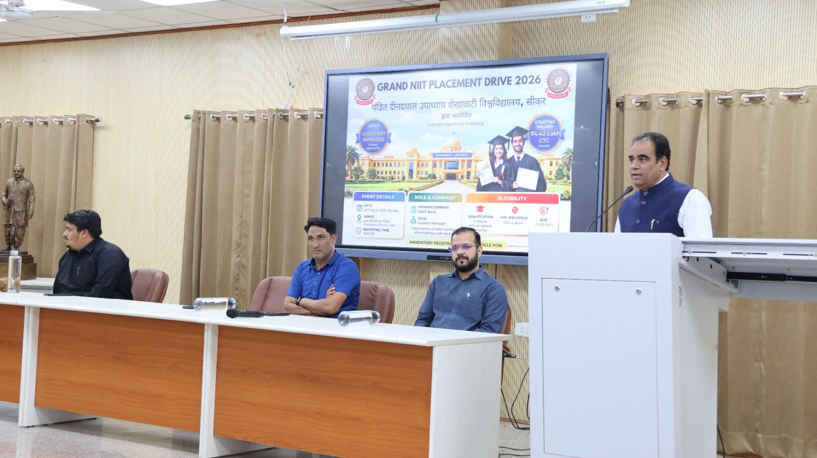 पंडित दीनदयाल उपाध्याय शेखावाटी विश्वविद्यालय में सोमवार को एनआईआईटी लिमिटेड, गुरुग्राम की ओर से प्लेसमेंट ड्राइव का आयोजन किया गया। कार्यक्रम का शुभारंभ विश्वविद्यालय के कुलगुरु प्रो. (डॉ.) अनिल कुमार राय एवं अकादमिक निदेशक और डॉ. आर.सी. मीणा ने दीप प्रज्वलित कर किया।