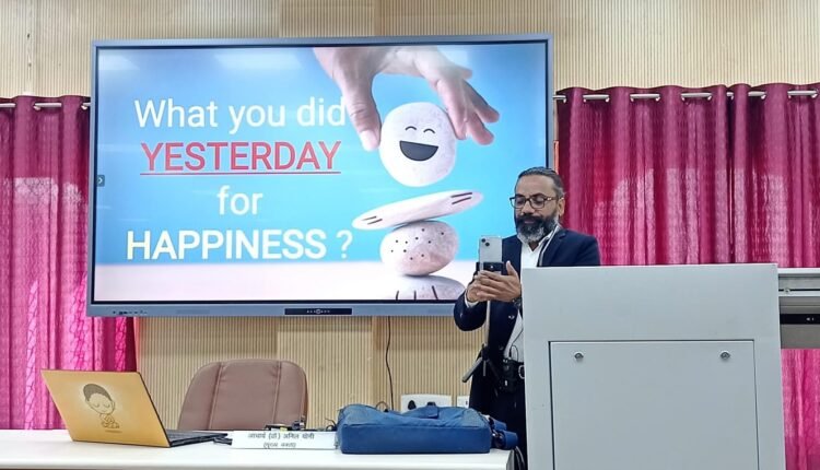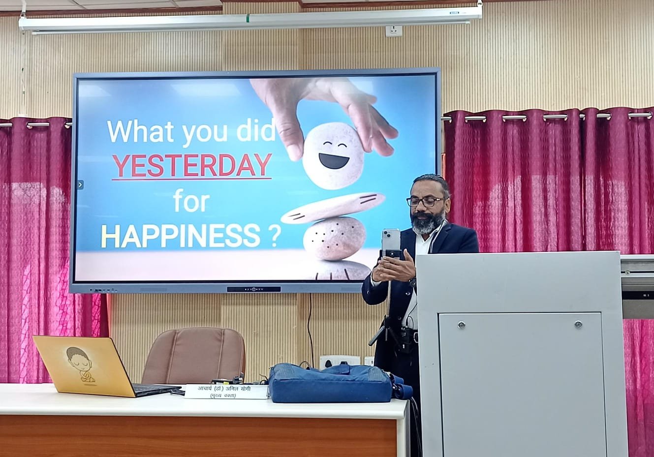 मुख्य वक्ता योग एवं नेचुरापैथी डिपार्टमेंट, माधव विश्वविद्यालय आबूरोड के अधिष्ठाता प्रो. अनिल योगी थे। उन्होंने कहा कि खुशी बाजार में नहीं मिलती, इसलिए इसे अपने आसपास ही तलाश करें। योग, प्राणायाम, प्रार्थना, ध्यान एवं सकारात्मक चिंतन से स्थायी आनंद को प्राप्त किया जा सकता है। उन्होंने विद्यार्थियों और फेकल्टी मैंबर्स के खुशी से जुड़े सवालों के जवाब भी दिए। उन्होंने स्टूडेंट्स को खुशी की अवधारणा और परिभाषा को विशेष रूप से समझाने का प्रयास किया।
