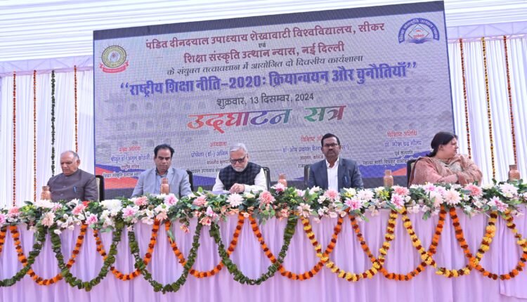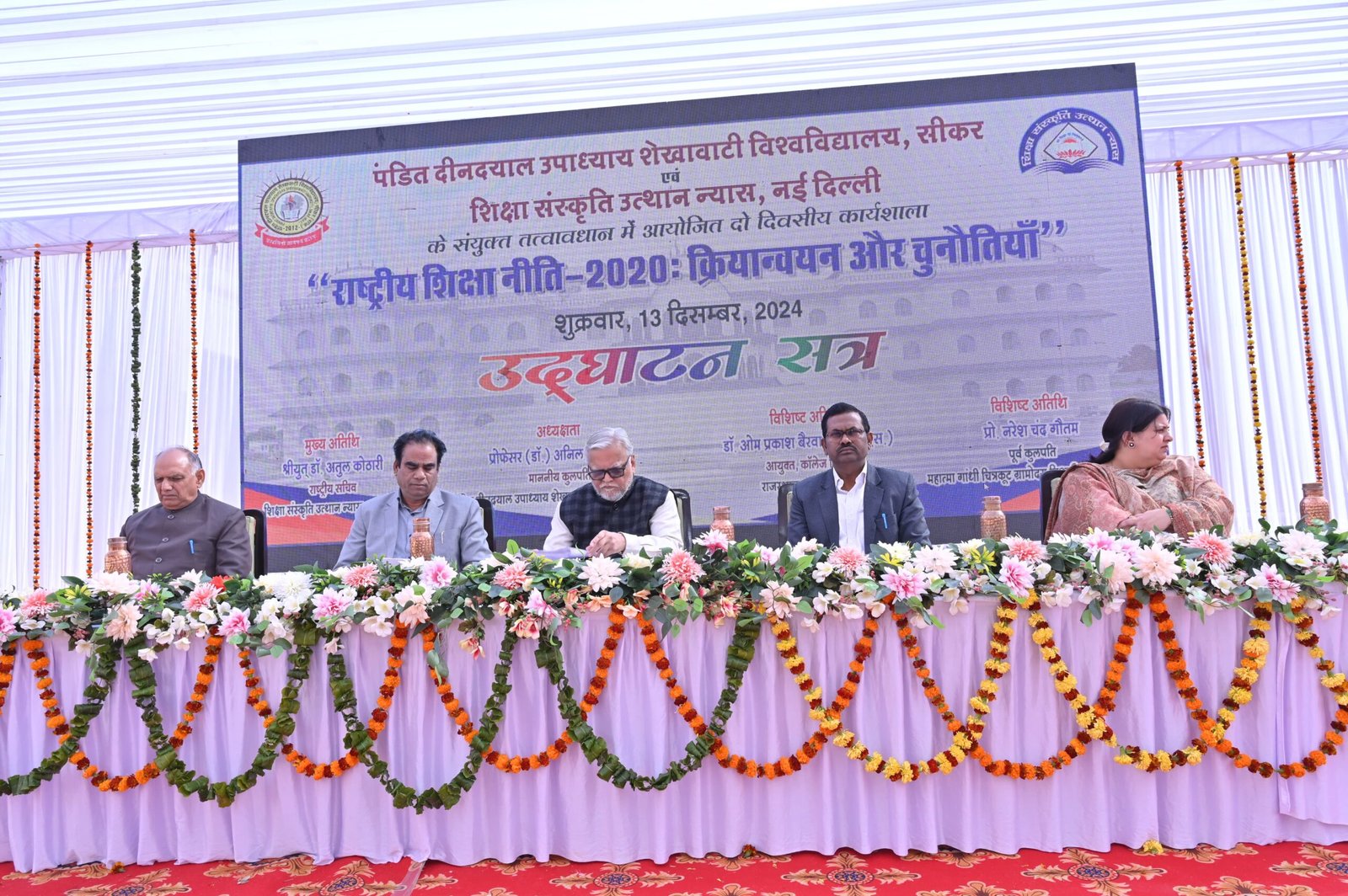 पंडित दीनदयाल उपाध्याय शेखावाटी विश्वविद्यालय, सीकर और शिक्षा संस्कृति उत्थान न्यास, नई दिल्ली के संयुक्त तत्वावधान में शुक्रवार को विवि कैम्पस में ‘राष्ट्रीय शिक्षा नीति 2020 : क्रियान्वयन एवं चुनौतियां’ विषय पर दो दिवसीय कार्यशाला का शुभारंभ हुआ। मां सरस्वती और पंडित दीनदयाल उपाध्याय जी की प्रतिमा के समक्ष दीप प्रज्वलन के साथ कार्यक्रम शुरू हुआ। शेखावाटी विवि के कुलपति प्रोफेसर डॉ. अनिल कुमार राय ने आगंतुक अतिथियों का स्वागत किया। उद्धाटन सत्र के मुख्य अतिथि शिक्षा संस्कृति उत्थान न्यास नई दिल्ली के राष्ट्रीय सचिव डॉ. अतुल भाई कोठारी थे। अध्यक्षता शेखावाटी विश्वविद्यालय के कुलपति प्रोफेसर डॉ. अनिल कुमार राय ने की। विशिष्ट अतिथि राजस्थान कॉलेज शिक्षा के आयुक्त डॉ. ओम प्रकाश बैरवा और महात्मा गांधी चित्रकूट ग्रामोदय विश्वविद्यालय, चित्रकूट के पूर्व कुलपति आचार्य (डॉ.) नरेश चंद्र गौतम थे।