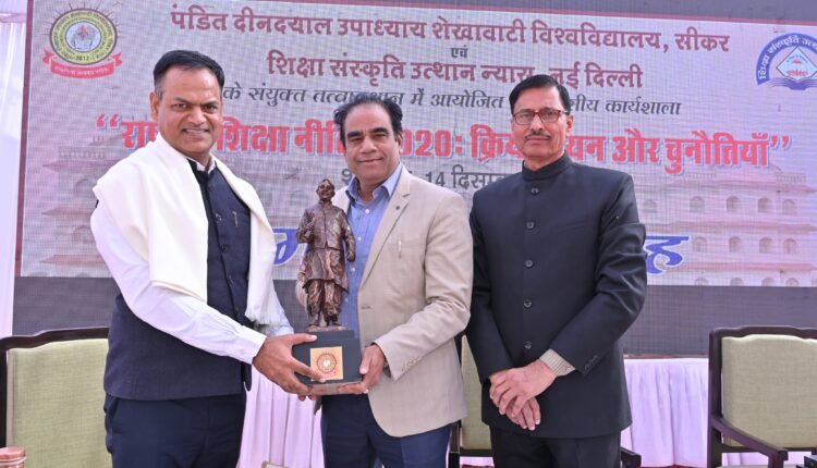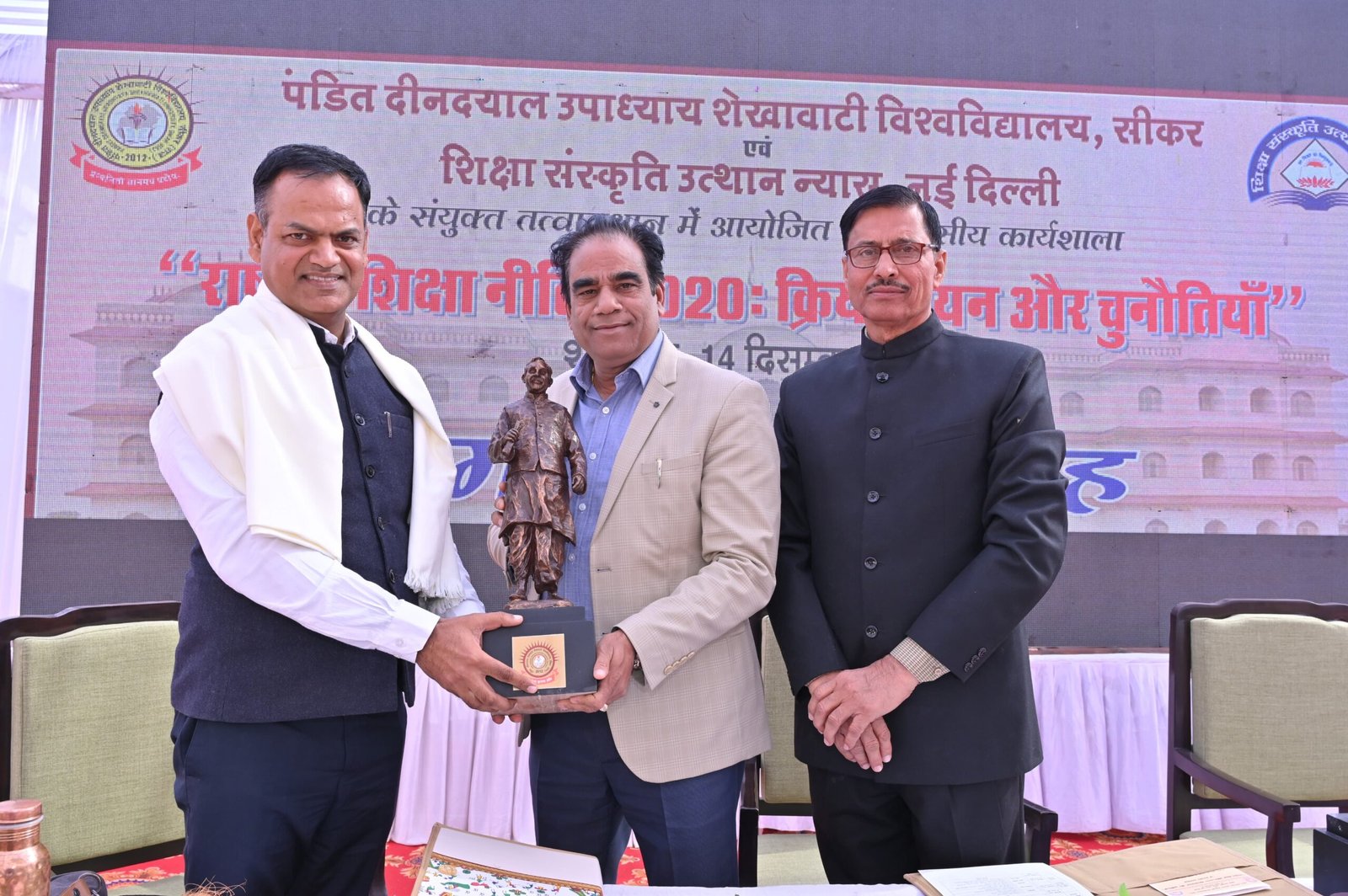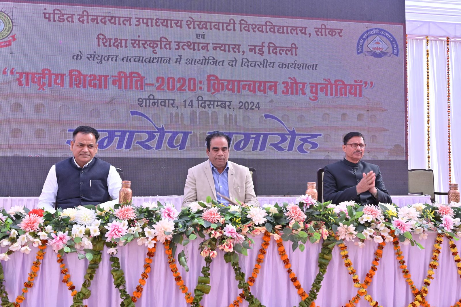 पंडित दीनदयाल उपाध्याय शेखावाटी विश्वविद्यालय, सीकर और शिक्षा संस्कृति उत्थान न्यास, नई दिल्ली के संयुक्त तत्वावधान में विवि में ‘राष्ट्रीय शिक्षा नीति 2020 – क्रियान्वयन एवं चुनौतियां’ विषय पर दो दिवसीय कार्यशाला का शनिवार को समापन हुआ। अंतिम दिन कई सत्रों में राष्ट्रीय शिक्षा नीति के विभिन्न पहलुओं, क्रियान्वयन और चुनौतियों पर गहन चिंतन मनन किया गया। शेखावाटी विश्वविद्यालय के कुलपति प्रोफेसर डॉ. अनिल कुमार राय ने वक्ताओं का स्वागत किया। मुख्य अतिथि चितरंजन सिंह राठौड़, सचिव प्रबन्ध समिति श्री कृष्ण सत्संग बालिका महाविद्यालय, सीकर और मुख्य वक्ता आचार्य (डॉ.) नारायण लाल गुप्ता राष्ट्रीय अध्यक्ष, अखिल भारतीय राष्ट्रीय शैक्षिक महासंघ थे।