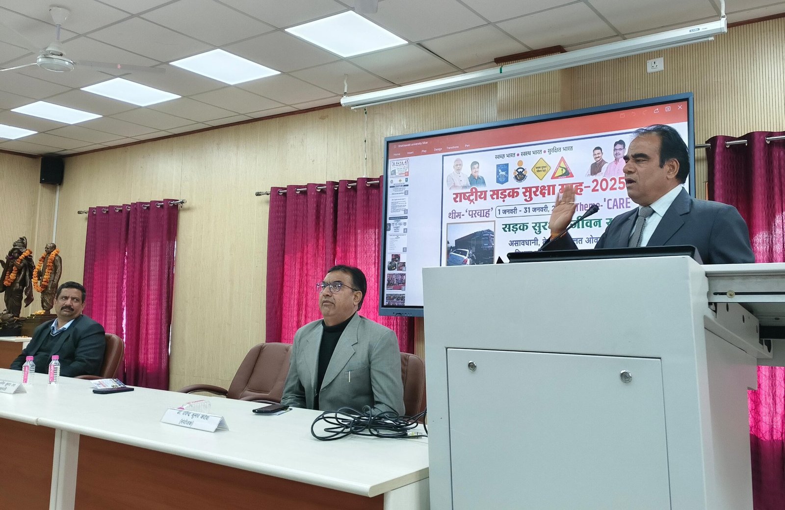 पंडित दीनदयाल उपाध्याय शेखावाटी यूनिवर्सिटी सीकर में गुरुवार को सड़क सुरक्षा जागरूकता कार्यक्रम आयोजित किया गया। राष्ट्रीय सड़क सुरक्षा महीने के तहत प्रादेशिक परिवहन विभाग सीकर की ओर से आयोजित कार्यक्रम के मुख्य वक्ता अतिरिक्त प्रादेशिक परिवहन अधिकारी डॉ वीरेन्द्र सिंह राठौड़ थे। अध्यक्षता शेखावाटी विवि के कुलपति प्रो.(डॉ.) अनिल कुमार राय ने की। डिप्टी रजिस्ट्रार एकेडेमिक डॉ रवींद्र कुमार कटेवा ने स्वागत उद्बोधन दिया और कार्यक्रम की रूप रेखा बताई।