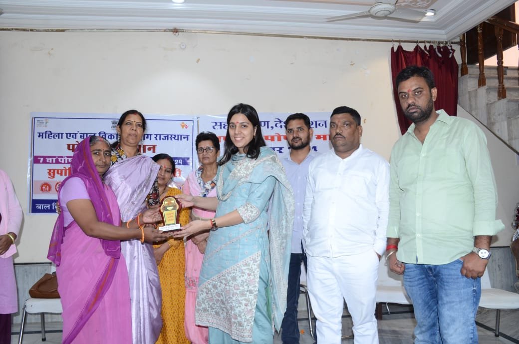 आंगनबाडी शिक्षिका शर्मिला व मन्जू देवी ने पोषण माह की थीम पर मोटे अनाज से रंगोली बनाकर पोषण का सन्देश दिया। इस दौरान व्यंजन व रंगोली प्रतियोगिता के विजेताओ को मोमेंटो देकर सम्मानित किया गया। विभाग के कनिष्ठ सहायक सुभाष वर्मा ने सभी का आभार जताते हुए धन्यवाद दिया। इस दौरान ब्लाॅक कॉर्डिनेटर विक्रम सिंह चौहान, बनवारी कुमावत, सानू चौहान व परियोजना की सभी आंगनबाडी शिक्षिकाएं मौजूद रही।