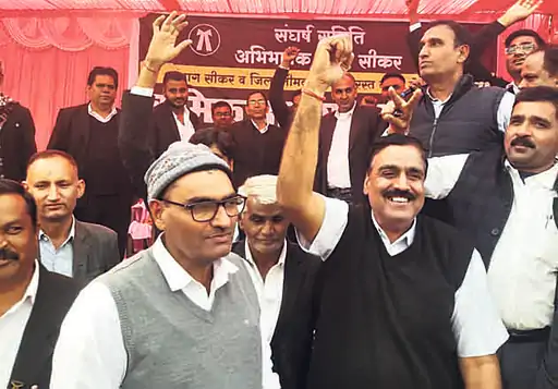 राज्य सरकार द्वारा सीकर को संभाग बनाने और नीमकाथाना जिले को निरस्त करने के विरोध में अभिभाषक संघ की संघर्ष समिति का धरना और अनशन शनिवार को भी लगातार जारी रहा। संघ के महासचिव नरेश भूकर ने बताया कि धरने व अनशन में संघ के अध्यक्ष भागीरथमल जाखड़ के नेतृत्व में पांच प्रमुख अधिवक्ता शामिल थे, जिनमें एडवोकेट अमरचंद पारीक, राजेंद्र शर्मा, प्रताप सिंह चौहान, मोहम्मद अयूब गौरी और विवेक प्रधान प्रमुख थे।