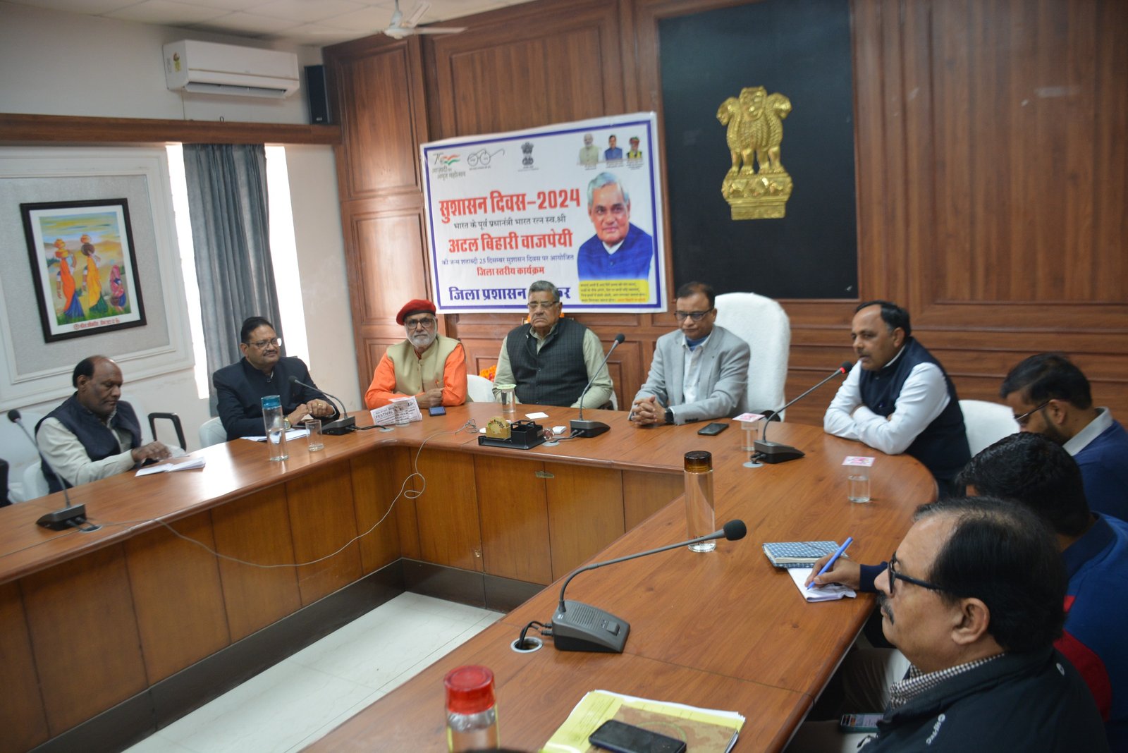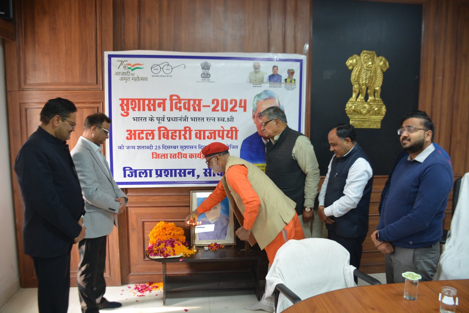 पूर्व प्रधानमंत्री एवं भारत रत्न स्वर्गीय अटल बिहारी वाजपेयी की जयंती के अवसर पर बुधवार को जिला कलेक्ट्रेट सभागार में सुशासन दिवस मनाया गया। जिला कलेक्टर शर्मा ने वाजपेयी के चित्र पर माल्यार्पण कर उन्हें श्रद्धांजलि अर्पित की। इस अवसर पर जिला कलेक्टर ने अधिकारियों एवं कर्मचारियों को प्रदेश में सुशासन के उच्चतम मापदंडों को स्थापित करने के लिए, शासन को अधिक पारदर्शी, सहभागी, जन-कल्याण केन्द्रित और जवाबदेह बनाने के लिए हरसंभव प्रयास करने एवं प्रदेश के नागरिकों के जीवन स्तर में सुधार लाने के लक्ष्य को पाने के लिए सदैव तत्पर रहने की सुशासन शपथ दिलायी।