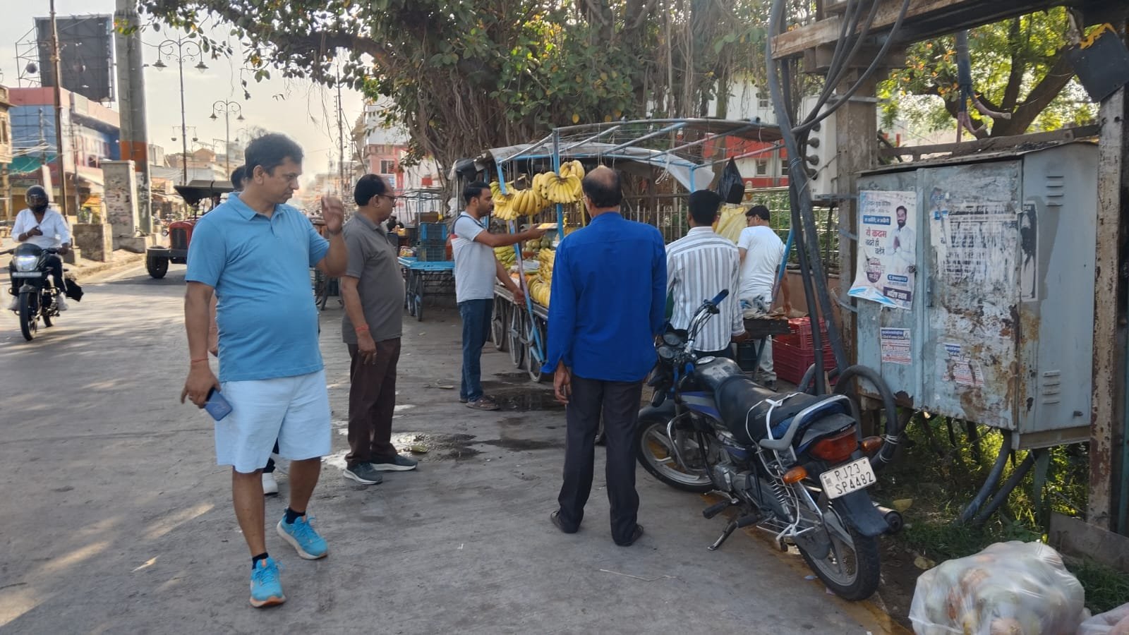 इसके पश्चात उन्होंने विभिन्न क्षेत्रों में पैदल भ्रमण कर साफ-सफाई व्यवस्थाओं का जायजा लिया। जाट बाजार में फल-फ्रूट एवं सब्जी विक्रेताओं तथा रेहड़ी-ठेला संचालकों को समझाइश करते हुए निर्देशित किया कि कचरा सड़क पर न फेंकें तथा गीले और सूखे कचरे को अलग-अलग डस्टबिन में डालें और कचरा वाहन आने पर ही उसमें डालें। साथ ही संबंधित जोन निरीक्षक को निर्देश दिए कि जगह-जगह चिपके पंपलेट एवं पोस्टर हटाकर साफ-सफाई सुनिश्चित की जाए।