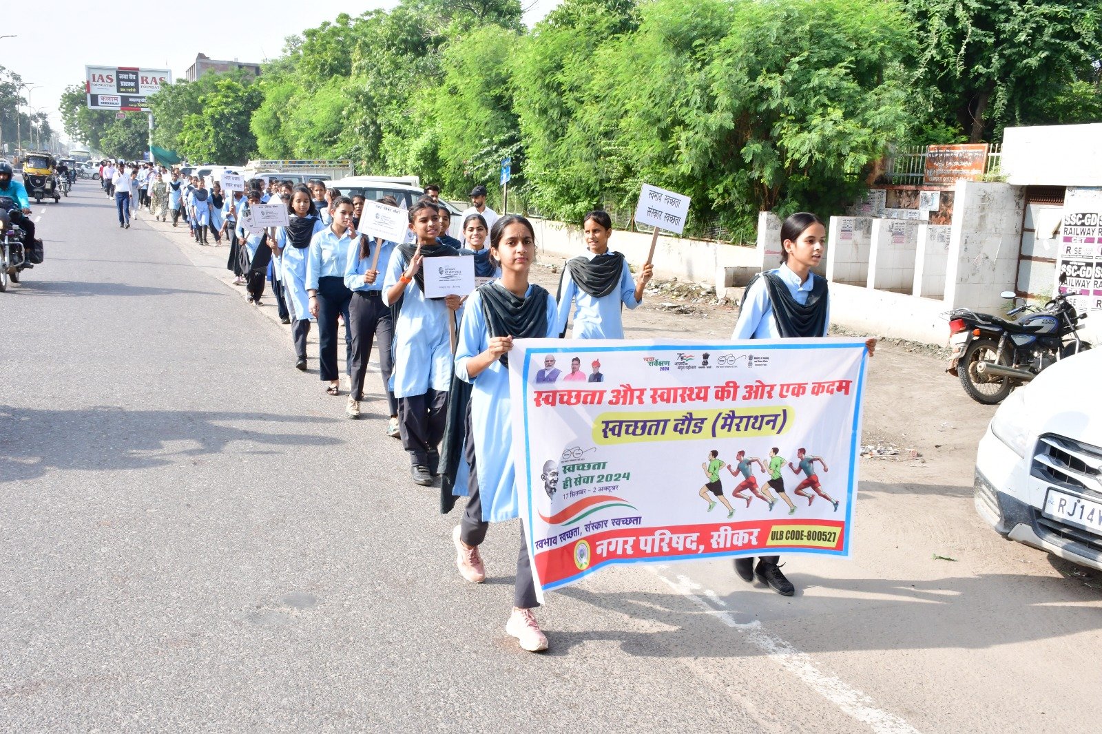 रैली में छात्र-छात्राओं ने ” हम सब ने ये ठाना है सीकर को स्वच्छ व सुन्दर बनाना है” प्लास्टिक कचरे को मिटाना है सीकर को स्वच्छ बनाना है” जागो सीकर जगमग सीकर ” “दूषित जल को हटाना है, डेगूं से सब को बचाना है ” स्वच्छता है बड़ा अभियान आप भी दे अपना योगदान, क्लीन सीकर ग्रीन सीकर आदि स्लोगनों के जयकारों के साथ रैली के माध्यम से शहर वासियों को स्वभाव स्वच्छता संस्कार की थीम के तहत स्वच्छता का संदेश दिया।