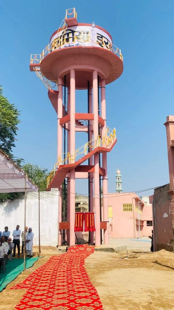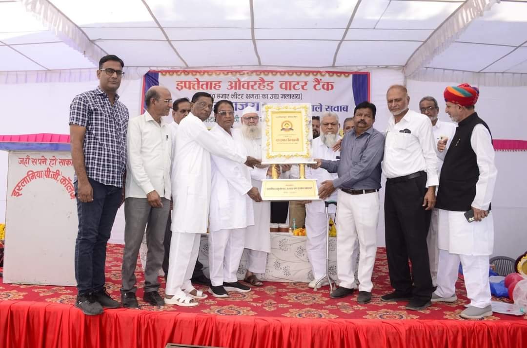 स्थानीय इस्लामिया स्कूल – कॉलेज परिसर में झुंझुनूं निवासी हाजी मोहम्मद इकबाल खोखर वल्द हाजी अनवर अहमद खोखर द्वारा अपनी वालिदा मोहतरम मरहूमा हाजन हाजरा के इसाले सवाब बनवाएं गए 50 हजार लीटर क्षमता के ओवर हैड टैंक (उच्च जलाशय) का लोकार्पण (इफ्तेताह) शनिवार दोपहर समारोह पूर्वक हुआ । समारोह की शुरूआत तिलावते कुरआन से हुई तत्पश्चात हाजी अनवर खोखर, ईदगाह के पेश इमाम हाफिज मोहम्मद इब्राहिम और इस्लामिया एज्युकेशनल, कल्चरल एण्ड वेलफेयर सोसायटी के वरिष्ठ उपाध्यक्ष हाजी इकबाल तंवर ने ओवरहेड टैंक की नाम पट्टिका का पर्दा हटाकर लोकार्पण किया । इससे पहले सोसायटी के पदाधिकारियों एवं सदस्यों क्रमशः हाजी सलीमुद्दीन जमींदार, हाजी मकसूद अहमद पठान, शौकत अली रंगरेज, मोहम्मद अली खत्री, सलीम कुरेशी, करार हैदर, सज्जाद हैदर, शब्बीर नारू, फारूक भाटी, हाजी मकबूल चौहान, शकील बहलीम, अंसार अहमद कुरेशी, जीएम मुगल और अब्दुल रजाक पंवार सहित कॉलेज प्राचार्य डॉ. मोहम्मद आरिफ व स्कूल प्राचार्य अब्दुल रउफ जोया ने अतिथियों का माल्यार्पण किया । साथ ही समारोह के मुख्य अतिथि हाजी अनवर खोखर को शॉल ओढ़ा, माला पहनाकर यादगार निशान (स्मृति चिह्न) भेंट किया। स्वागत भाषण संयुक़्त सचिव प्रतिनिधि निसार अहमद जाटू ने पढ़ा और जामा मस्जिद के पेश इमाम हाफिज मोहम्मद इब्राहिम ने खिताब किया जबकि अंत में आभार सोसायटी के वरिष्ठ उपाध्यक्ष हाजी इकबाल तंवर ने जताया । इसी तरह उक़्त ओवर हैड टैंक के निर्माण में महत्वपूर्ण भूमिका निभाने वाले सोसायटी के सम्मानित सदस्य हाजी मकबूल चौहान का भी साफा पहनाकर यादगार निशानी के साथ अभिनन्दन किया गया। संचालन शिबा पठान ने किया।