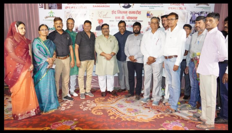 झुन्झुनूं स्थित इन्दिरा नगर में निज निवास पर राजस्थान मदरसा बोर्ड के अध्यक्ष एम.डी. चोपदार द्वारा ईद मिलन समारोह आयोजित किया गया. जिले की गंगा जमुनी तहजीब के प्रहरी के रूप में जिले भर में एम.डी. चोपदार ने अपना एक मुकाम बनाया है. इस कार्यक्रम में देश भर से आये हुए कलाकारों ने साम्प्रदायिक सदभाव से संबंधित गजलों एवं गीतों के माध्यम से सभा को मंत्रमुग्ध कर दिया.इस अवसर पर एम.डी. चोपदार ने कहा कि हमारा मुल्क दुनिया में सबसे बेहतरीन मुल्क है और झुन्झुनूं जिला गंगा जमुनी संस्कृति का सबसे बड़ा आधार है. हमारी ये संस्कृति बनी रहनी चाहिये तथा धर्म, जाति से परे हटकर हमें इंसानियत के धर्म का पालन करना चाहिये. ईद भाईचारे एवं मोहब्बत का पैगाम देता है. इस कार्यक्रम का उद्देश्य भी यही है कि हमारा भाईचारा बना रहे तथा देश में सुख-शांति रहे. इस अवसर पर हजारों कार्यकर्ताओं ने अपने महबूब लीडर एम.डी. चोपदार का जन्मदिवस भी हर्षोल्लास के साथ मनाया. कार्यक्रम में हजारों की तादाद में कार्यकर्ता एवं उनके चाहने वाले उपस्थित थे. इस अवसर पर डॉ. सत्तार दीवान, सलीम दीवान, डॉ. अनीश नागरा, मदरसा बोर्ड के सचिव मुर्करम शाह, जिला अल्पसंख्यक कल्याण अधिकारी मो. अनीश खान, समाज कल्याण अधिकारी अशफाक खां, दरगाह गद्दीनशीन एजाज नबी साहब, पूर्व सभापति खालिद हुसैन, सूचना एवं जनसम्पर्क अधिकारी हिमांशु सिंह, आमीन चोपदार, पूर्व जिला शिक्षा अधिकारी सम्पतराम बारूपाल, डॉ. रजनीश माथुर, डॉ. वी.डी. बाजिया, डॉ. राजवीर राव, पार्षद संजय पारीक, बिजेन्द्र चौधरी, महेश जाखल, पंकज धनखड़, गुलाम नबी दानका, मो. अली खोखर, डॉ. जगदेव सिंह, रमजान चोपदार, मुकेश हालू, अजय बाड़लवास, प्रहलाद, नवीन ढ़ाका, मनीष चौधरी, हरफूल सिंह, बीरबलराम, रामनिवास, एडवोकेट जहीर मो. फारूकी, मतलूब चायल, सज्जाद पहलवान, खादिम खोखर, अली हसन परवेज, सलीम गहलोत, युनुस रंगरेज, एडवोकेट इरशाद फारूकी, फारूक खां सोती, महमूद खां, साजीद दीवान, मनवर दीवान सहित हजारों कार्यकर्ता उपस्थित थे.
